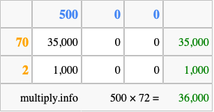 That's all there is to it! As you can see from the box above, the answer to 500 times 72 using the box method is 36,000.