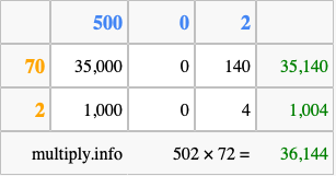 That's all there is to it! As you can see from the box above, the answer to 502 times 72 using the box method is 36,144.