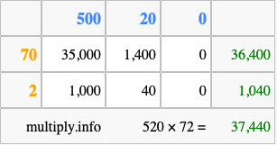 Below is an illustration showing you how to calculate 520 times 72 using the box method, using the instructions above.