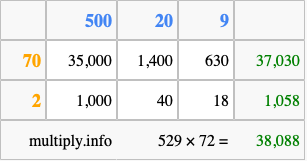 That's all there is to it! As you can see from the box above, the answer to 529 times 72 using the box method is 38,088.