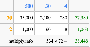 That's all there is to it! As you can see from the box above, the answer to 534 times 72 using the box method is 38,448.