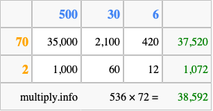 That's all there is to it! As you can see from the box above, the answer to 536 times 72 using the box method is 38,592.