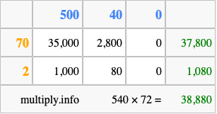 That's all there is to it! As you can see from the box above, the answer to 540 times 72 using the box method is 38,880.