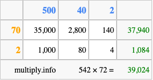 That's all there is to it! As you can see from the box above, the answer to 542 times 72 using the box method is 39,024.