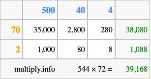 That's all there is to it! As you can see from the box above, the answer to 544 times 72 using the box method is 39,168.
