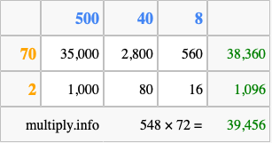 That's all there is to it! As you can see from the box above, the answer to 548 times 72 using the box method is 39,456.
