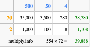That's all there is to it! As you can see from the box above, the answer to 554 times 72 using the box method is 39,888.