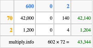 That's all there is to it! As you can see from the box above, the answer to 602 times 72 using the box method is 43,344.