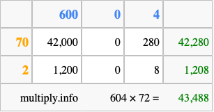 That's all there is to it! As you can see from the box above, the answer to 604 times 72 using the box method is 43,488.