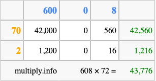 That's all there is to it! As you can see from the box above, the answer to 608 times 72 using the box method is 43,776.
