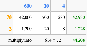 That's all there is to it! As you can see from the box above, the answer to 614 times 72 using the box method is 44,208.