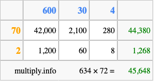 That's all there is to it! As you can see from the box above, the answer to 634 times 72 using the box method is 45,648.