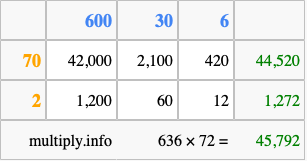 That's all there is to it! As you can see from the box above, the answer to 636 times 72 using the box method is 45,792.