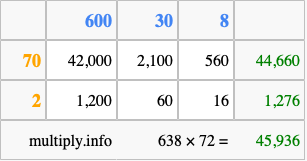 That's all there is to it! As you can see from the box above, the answer to 638 times 72 using the box method is 45,936.