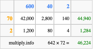 That's all there is to it! As you can see from the box above, the answer to 642 times 72 using the box method is 46,224.