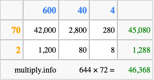That's all there is to it! As you can see from the box above, the answer to 644 times 72 using the box method is 46,368.