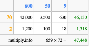 Finally, we add up all the sums we found in step 3 to get our final answer to 659 times 72.