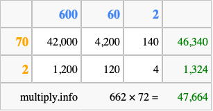That's all there is to it! As you can see from the box above, the answer to 662 times 72 using the box method is 47,664.