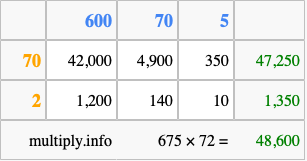Finally, we add up all the sums we found in step 3 to get our final answer to 675 times 72.