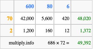 That's all there is to it! As you can see from the box above, the answer to 686 times 72 using the box method is 49,392.