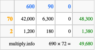 That's all there is to it! As you can see from the box above, the answer to 690 times 72 using the box method is 49,680.