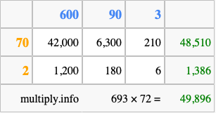 Below is an illustration showing you how to calculate 693 times 72 using the box method, using the instructions above.
