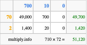That's all there is to it! As you can see from the box above, the answer to 710 times 72 using the box method is 51,120.