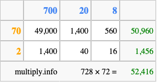 That's all there is to it! As you can see from the box above, the answer to 728 times 72 using the box method is 52,416.