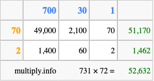 That's all there is to it! As you can see from the box above, the answer to 731 times 72 using the box method is 52,632.