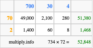 Finally, we add up all the sums we found in step 3 to get our final answer to 734 times 72.