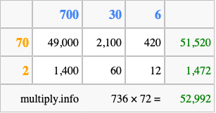 That's all there is to it! As you can see from the box above, the answer to 736 times 72 using the box method is 52,992.