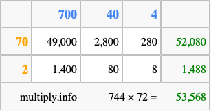 Below is an illustration showing you how to calculate 744 times 72 using the box method, using the instructions above.