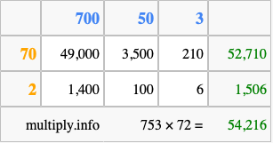 Below is an illustration showing you how to calculate 753 times 72 using the box method, using the instructions above.