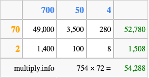 That's all there is to it! As you can see from the box above, the answer to 754 times 72 using the box method is 54,288.