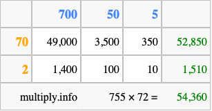 Below is an illustration showing you how to calculate 755 times 72 using the box method, using the instructions above.