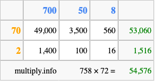 That's all there is to it! As you can see from the box above, the answer to 758 times 72 using the box method is 54,576.
