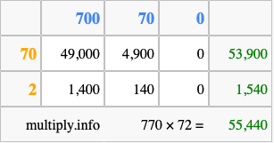 That's all there is to it! As you can see from the box above, the answer to 770 times 72 using the box method is 55,440.