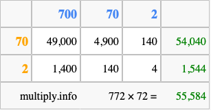 Below is an illustration showing you how to calculate 772 times 72 using the box method, using the instructions above.