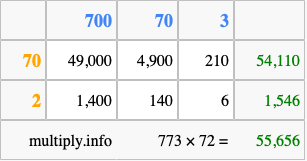That's all there is to it! As you can see from the box above, the answer to 773 times 72 using the box method is 55,656.