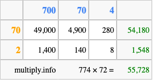 Below is an illustration showing you how to calculate 774 times 72 using the box method, using the instructions above.
