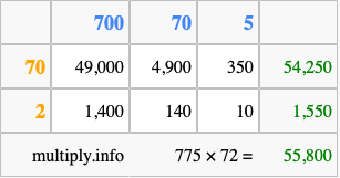 Finally, we add up all the sums we found in step 3 to get our final answer to 775 times 72.