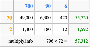 Finally, we add up all the sums we found in step 3 to get our final answer to 796 times 72.