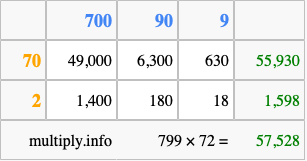 Below is an illustration showing you how to calculate 799 times 72 using the box method, using the instructions above.
