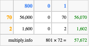 That's all there is to it! As you can see from the box above, the answer to 801 times 72 using the box method is 57,672.
