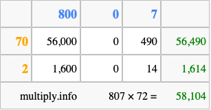 That's all there is to it! As you can see from the box above, the answer to 807 times 72 using the box method is 58,104.
