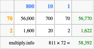 That's all there is to it! As you can see from the box above, the answer to 811 times 72 using the box method is 58,392.