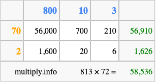 That's all there is to it! As you can see from the box above, the answer to 813 times 72 using the box method is 58,536.