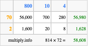 Finally, we add up all the sums we found in step 3 to get our final answer to 814 times 72.