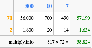 Below is an illustration showing you how to calculate 817 times 72 using the box method, using the instructions above.