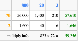 That's all there is to it! As you can see from the box above, the answer to 823 times 72 using the box method is 59,256.